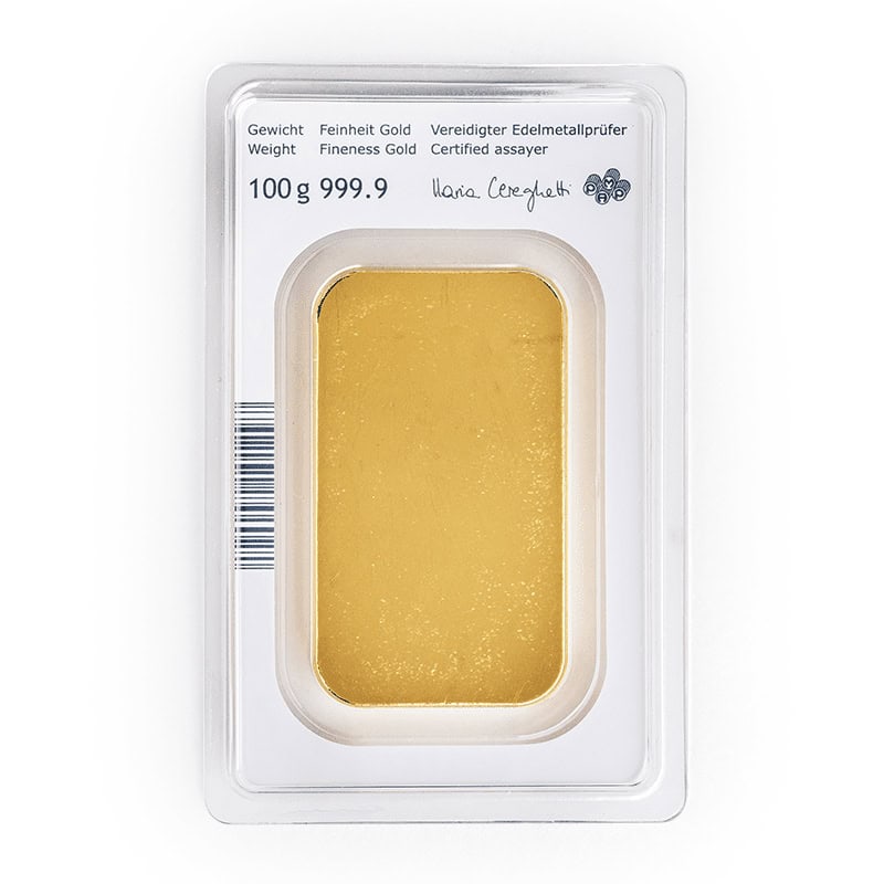 Acuñado en oro puro 999,9 (24k), este lingote de 100 gramos ofrece un formato perfecto para quienes buscan comenzar en la inversión en oro físico o diversificar su ahorro con una pieza de tamaño compacto y alta liquidez.