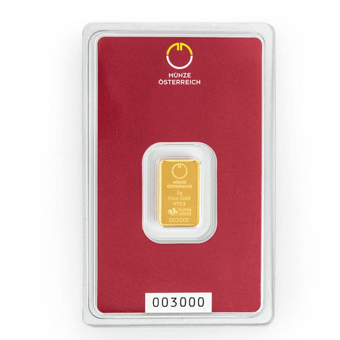 Lingote de oro Münze Österreich 2g .9999 (24k) en blíster certificado. Oro europeo de inversión, seguro y de máxima pureza. Formato y peso ideal para regalar o como inicio en la inversión en metales preciosos.