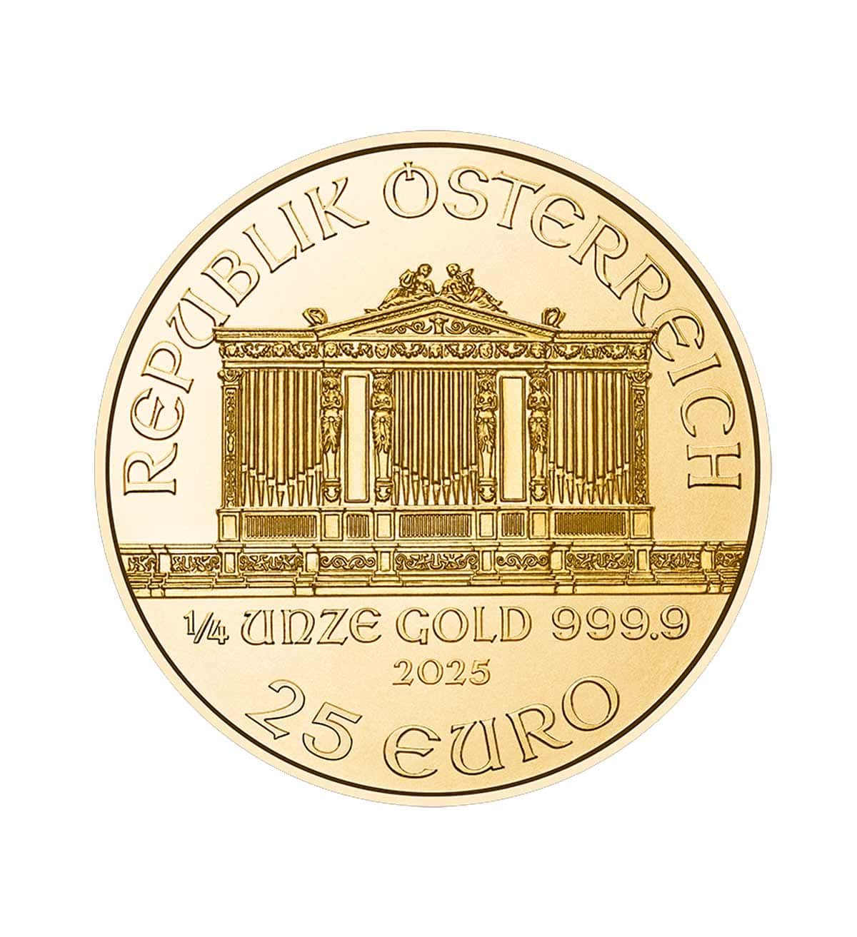 La Moneda Bullion Filarmónica de Viena de 1/4 oz en oro (2025) es una de las monedas de inversión europeas más reconocidas en el mundo. Fabricada por la Casa de la Moneda de Austria (Austrian Mint) en oro puro 999,9 (24k), destaca por su icónico diseño de instrumentos musicales, símbolo de la célebre Orquesta Filarmónica de Viena.
