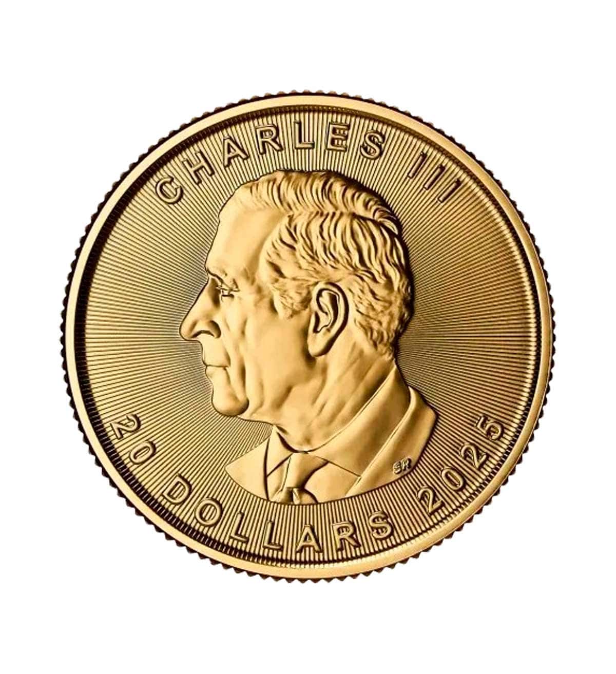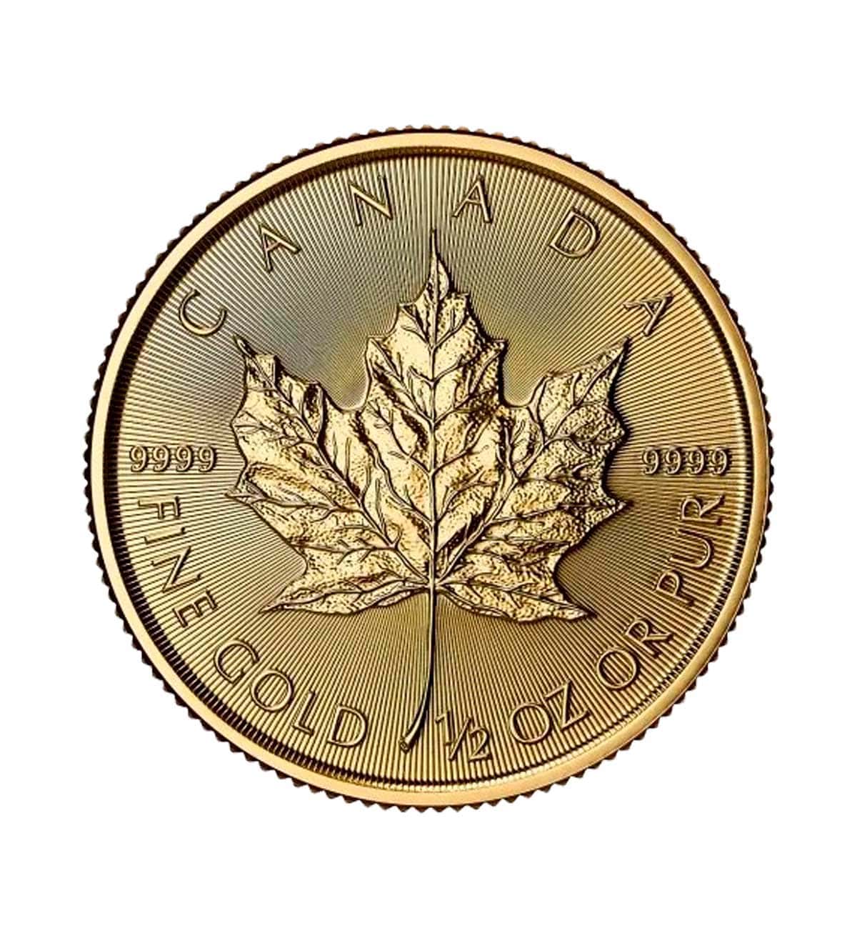 Moneda bullion Maple Leaf oro 1/2 oz – 2025. Oro puro 999,9 (24k) con diseño de hoja de arce. Acuñada por Royal Canadian Mint. Alta pureza, seguridad y valor de inversión.